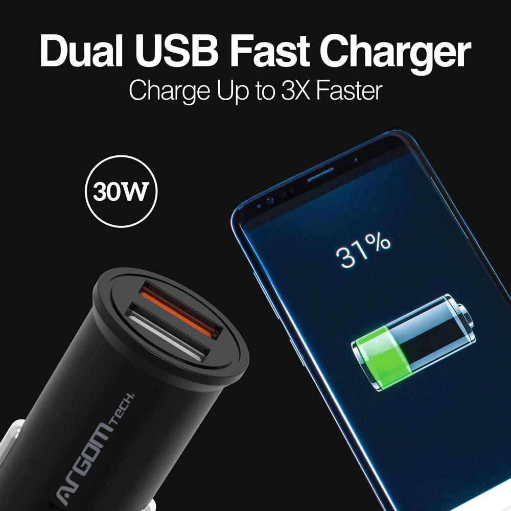 El cargador para auto Dual USB de 30W (modelo ARG-AC-0111BK) es un accesorio práctico y esencial para mantener tus dispositivos móviles siempre cargados mientras estás en movimiento. Diseñado con tecnología de carga rápida y protección segura, este cargador garantiza que puedas cargar hasta dos dispositivos simultáneamente, de forma eficiente y confiable.
