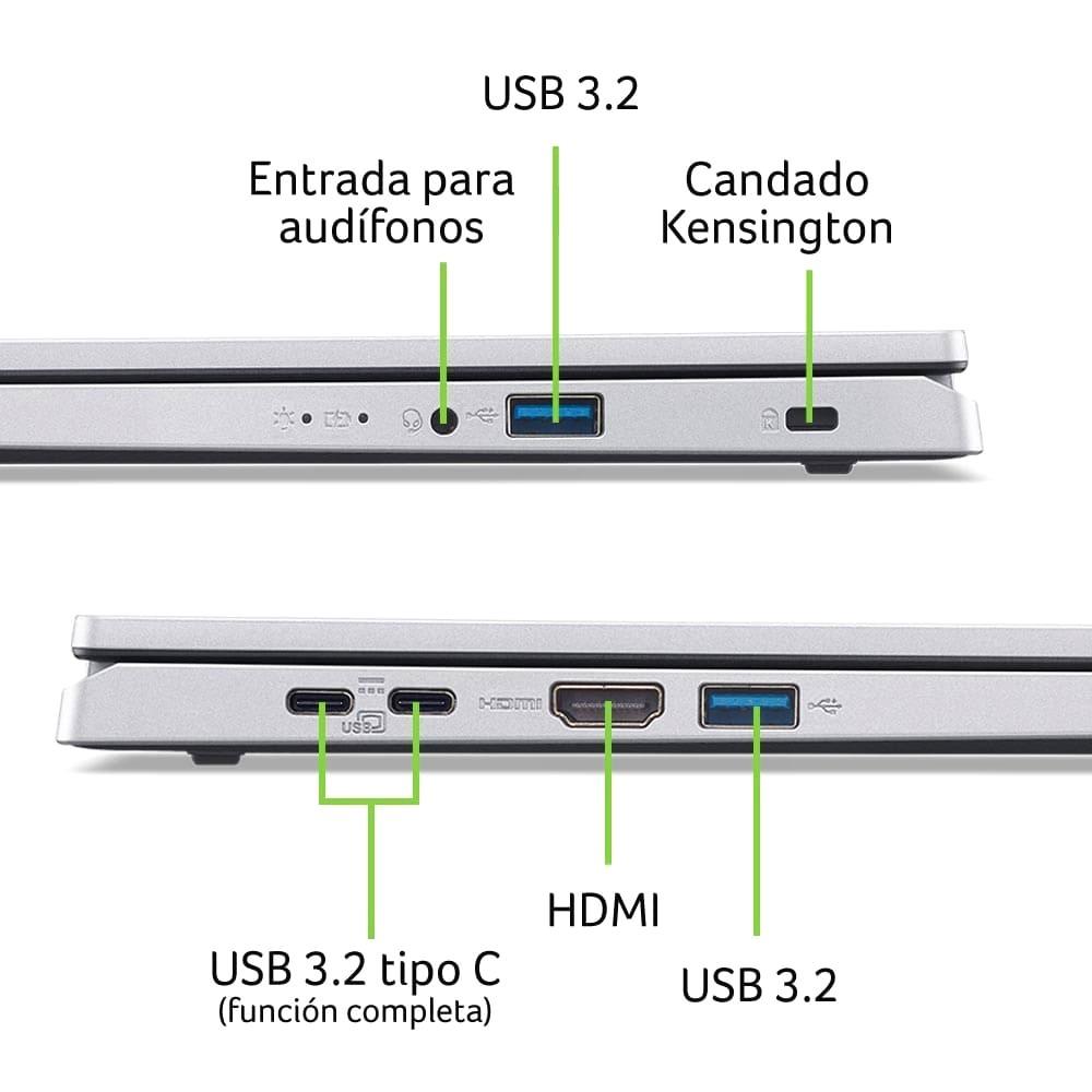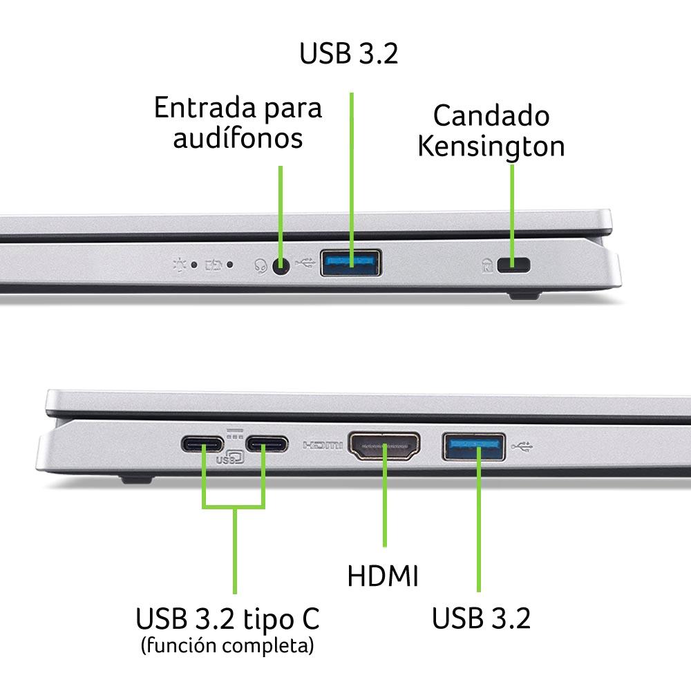 En conectividad, la Acer Aspire incluye Wi-Fi 6, Bluetooth 5.1, 2 puertos USB 3.0, 2 puertos USB Tipo C y 1 salida HDMI, ofreciéndote versatilidad para conectar todos tus dispositivos. La batería de 53Wh asegura horas de autonomía para acompañarte en cualquier lugar.